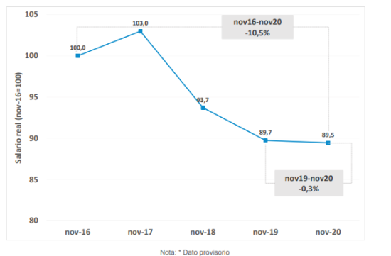 En términos reales, teniendo en cuenta la variación del nivel de precios, en noviembre de 2020 tanto la remuneración promedio como la mediana se contrajeron un 0,3% frente a noviembre de 2019.