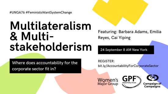 We are thrilled to invite you to a UNGA76 Side Event titled Multi-lateralism & Multi-stakeholderism: Where does accountability for the corporate sector fit in? When September 24th at 8:00 AM New York / 8:00 PM Beijing / 2:00 PM CET What An event exploring corporate influence across the United Nations System, and identifying ways in which civil society and all actors can resist corporate influence with a view to build a more accountable and equitable system that operates in the interests of people and planet, rather than profit. Register bit.ly/AccountabilityForCorporateSector Interpretation Available in French and Spanish Corporate influence across the UN system manifests in many ways and these methods/means are increasing. From the introduction of Public-Private Partnerships (PPPs) to newer language regarding “multistakeholderism” and “networked multilateralism”, corporations are being offered varying levels of status and access to many policymaking spaces. At the same time, pushes to democratize these spaces and to be inclusive of all partners appear to be leaving behind civil society, specifically the most marginalized civil society organizations including feminist and grassroots women-led organizations, and movements from the Global South. At large, this corporatization of the UN legitimizes the importance of the business and corporate sector in international decision-making, bringing business closer to the values of the UN. Some specific cases include the UN’s MOU with the World Economic Forum (WEF) from the S-G’s office, the International Chamber of Commerce (ICC) and its observer status in the General Assembly and the Global Compact and its “10 Principles” for corporate sustainability. This joint event, held in the margins of the 76th Session of the UNGA and the SDG Moment will explore this “dark side” of multistakeholderism at the United Nations and in other intergovernmental fora, and identify ways in which civil society and all actors can resist corporate influence with a view to build a more accountable and equitable system that operates in the interests of people and planet, rather than profit. Help us spread the word: Share the event on your Twitter using the sample tweet below and the graphic attached! Sample Tweet: 📅 Sept 24 at 8am New York / 8pm Beijing / 2pm CET 📲 Register: bit.ly/AccountabilityForCorporateSector #FeministsWantSystemChange