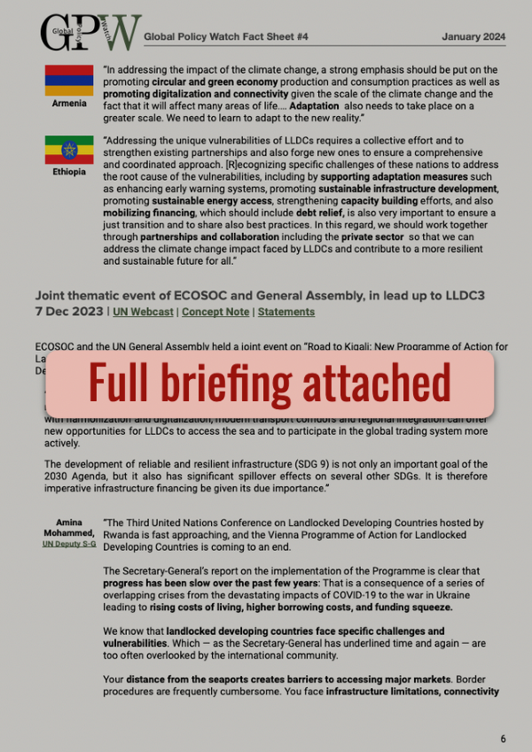 The Third UN Conference on Landlocked Developing Countries (LLDC3) will be held on 18-21 June 2024 in Kigali, Rwanda at the highest possible level, including Heads of State and Government. The main agenda for LLDC3 is to finalize and adopt the new development agenda for the landlocked developing countries for the next decade, the successor to the Vienna Programme of Action in 2024. This Global Policy Watch briefing explores the pertinent issues and trajectory of the process, with the different priorities revealed in Member State statements. Source: Global Policy Watch (GPW).