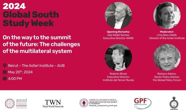 As part of the 2024 Global South Study Week on Sustainable Human Development, Arab NGO Network for Development (ANND), Third World Network (TWN), The Asfari Institute for Civil Society and Citizenship, Global Policy Forum and Social Watch invite you to a special session: “On the Way to the Summit of the Future: The Challenges of the Multilateral System.” This hybrid event will explore critical global issues and the efficacy of multilateralism in addressing them. Date: May 20, 2024 / Time: 4:00 pm Beirut Time (Confirm your local time) Location: the Asfari Institute - AUB You can also attend via Zoom: https://bit.ly/4bgAn6t Moderator: Lina Abou Habib, Director of the Asfari Institute. Speakers: Ziad Abdel Samad (Executive Director, Arab NGO Network for Development - ANND), Roberto Bissio (Coordinator, Social Watch), Barbara Adams (Senior Policy Advisor, Global Policy Forum). For more information download pdf.