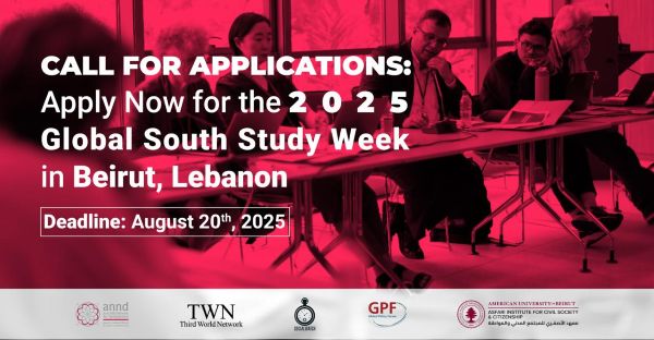 Call for Applications: Apply Now for the 2025 Global South Study Week in Beirut, Lebanon Deadline: August 20, 2025 Are you a young civil society activist from the Global South working on development, macroeconomic issues, multilateralism, governance, gender, climate, digital justice? Are you advocating for sustainable human development and addressing inequalities in your region? Would you like to take part in a fully-funded week of knowledge exchange, advocacy, and regional solidarity in Beirut? The Arab NGO Network for Development (ANND), Third World Network, Social Watch, Global Policy Forum, and the Asfari Institute at AUB invite you to apply to the Global South Study Week 2025 on: “Alternatives in Governance and Sustainable Human Development” When: Week of November 10, 2025 Where: Beirut, Lebanon Costs: Travel and accommodation are fully covered Language: Interpretation provided but basic English is desirable Why Apply? - Participate in in-depth discussions with civil society peers from the Global South - Build your knowledge of global development frameworks and policy alternatives - Join a long-term network of Study Week alumni and regional collaborators - Strengthen your advocacy and engagement at national, regional, and international levels About the Program The Study Week builds on years of successful collaboration to address shared structural challenges to sustainable human development. It supports civil society actors in: - Enhancing their positions on global development issues - Building collective advocacy strategies grounded in solidarity and equity - Promoting systemic change from the Global South perspective Who Should Apply? We are looking for passionate young people who are: - Under 40 years old - From a Global South country - Holding a university degree in development, economics, political/social sciences, international relations, or human rights - Endorsed by a local, national, or regional NGO - Active in advocacy or coordination work on one or more of the following: - Development, multilateralism, global governance - Debt, trade and investment, tax justice - Social justice, climate change, biodiversity, agriculture, gender justice Only shortlisted candidates will be contacted by the Selection Committee Representatives. How to Apply