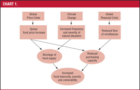 The diagram below illustrates the impact of the inter-related global crises in climate change, commodity prices and economic and financial crises on poverty and food insecurity.
