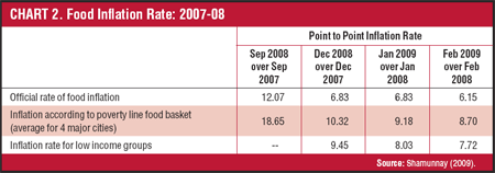 Food prices. In addition to the massive loss in domestic production in 2007 and 2008 following two devastating floods and cyclone Sidr, another major contributor was the global rise in food and commodity prices. The food inflation rate for the poor was much higher, exceeding 20% towards the end of 2007. Chart 2 presents the official food inflation rates, including the overall rate and the rate estimated for the poverty line food basket. It is worth to mention that although the bumper crops in 2008 and 2009 led to aggregate food supply and that, as a result of close monitoring by the Government, food prices, particularly those of rice and edible oil went down significantly, the problem remains in distribution. The level of food insecurity among the poorest households, particularly in the ecologically vulnerable areas, has not been solved. Moreover, the high costs of production have lowered the farmers’ margin. A study by the Dhaka-based think tank Centre for Policy Dialogue (CPD) indicates that 48.5% of people in Bangladesh do not have enough money to buy basic food items such as rice, compared to 40% in 2005.3 The CPD report stresses that, “as a consequence of high prices of food grains and high level of general Inflation, an additional 12.1 million people (8.5% of total population) became poor, between January 2005 and March 2008”.