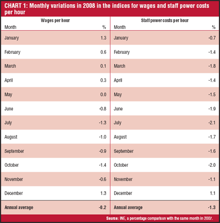 An assessment of the variations in the general index of wages per hour and the cost of staff power, prepared monthly by the National Statistics Institute, shows the consequences. Wages were negative as from June 2008, having experienced no changes during May, but lower than the second index, which considers wages from the employer’s perspective.