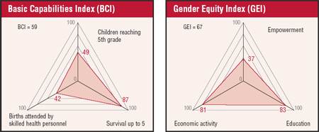 Regarding environmental sustainability, the proportion of land area covered by forests decreased from 21.3% to 18.3%; and the rural population with access to improved water sources increased from 53.5% to 58.5%. Under Goal 8 of the MDGs, debt service as a percentage of exports of goods and services decreased from 20.4% to 15.8%.
