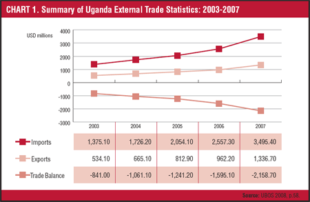 According to the IMF World Economic Outlook report 2008, a decline in world growth of one percentage point would lead to a 0.5 percentage point drop in Africa’s gross domestic product (GDP). The report anticipated the possibly serious effects of the global financial crisis on Africa in terms of trade, foreign direct investment (FDI) and aid resources. It also noted that while the correlation between African GDP and world GDP between 1980 and 1999 had been 0.5, it was only 0.2 between 2000 and 2007. Meanwhile, the UNCTAD World Investment Report 2008 showed FDI inflows to Uganda for the years 2004, 2005, 2006 and 2007 to be USD 295 million, USD 380 million, USD 400 million and USD 368 million.