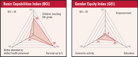 The general participation of women, who constitute 25.7% of the labour force, continues to drop significantly. The education gap is considerable; at 65%, female illiteracy is among the highest in developing countries. The following table shows the gender gap in education, according to 2005 statistics.