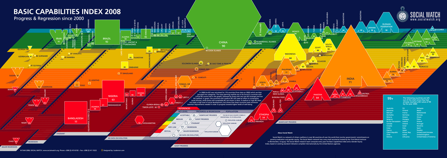 Progress in basic social indicators slowed down last year all over the world and at the present rate it does not allow for the internationally agreed poverty reduction goals to be met by 2015, unless substantial changes occur. This is the main conclusion that can be extracted from the 2008 figures of the Basic Capabilities Index (BCI), calculated by Social Watch. Out of 176 countries for which a BCI figure can be computed, only 21 register noticeable progress in relation to how they were in 2000. Other 55 countries show some progress, but at a slow rate, while 77 countries are stagnated or worse. Information is insufficient to show trends for the remaining 23. As the impact of the food crisis that started in 2006 begins to be registered by the new statistics coming in, the situation is likely to get worse in the next months. Contrary to frequent claims that poverty is diminishing fast in the world, the index computed by Social Watch shows that the deficient coverage of the basic needs required to escape poverty persists; even more, it is increasing, in spite of impressive economic growth in most developing countries. |