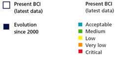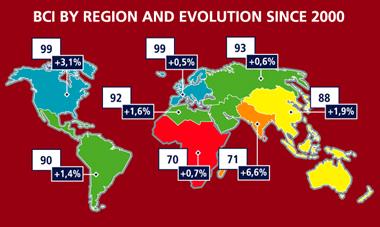 | LATIN AMERICA AND CARIBBEAN: Slight progress, with some countries regressing. EUROPE AND NORTH AMERICA: Acceptable BCI level reached before 2000. SOUTH ASIA: Significant progress. India improving fast, pushes the region up. CENTRAL ASIA: Slight progress, with some countries regressing. MIDDLE EAST AND NORTH AFRICA: Slight progress. EAST ASIA AND PACIFIC: Slight progress. No recent evolution data for China. SUB-SAHARAN AFRICA: Average progress is extremely slow, with some countries regressing even further from already low levels. At the current rate, the region would need more than a century to reach an acceptable BCI. |