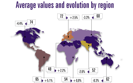 GEI performance by region has North America in first place (74), Europe second (72), Latin America and the Caribbean third (65) and East Asia and the Pacific fourth (62). The regions with the lowest GEI values are, in descending order, Central Asia (60), Sub-Saharan Africa (54), South Asia (52) and the Middle East and North Africa (48). The GEI trends show that although North America has the highest GEI values it is the region that has most regressed in recent years.