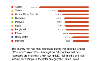 The country that has most regressed during this period is Angola (21%) and Turkey (13%). Amongst the 10 countries that most regressed are ones with a low, lower-middle, upper-middle and high income, for example in the latter category the United States