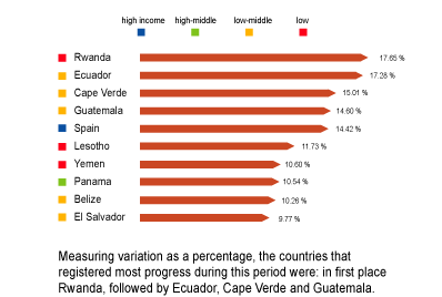 Measuring variation as a percentage, the countries that registered most progress during this period were: in first place Rwanda, followed by Ecuador, Cape Verde and Guatemala