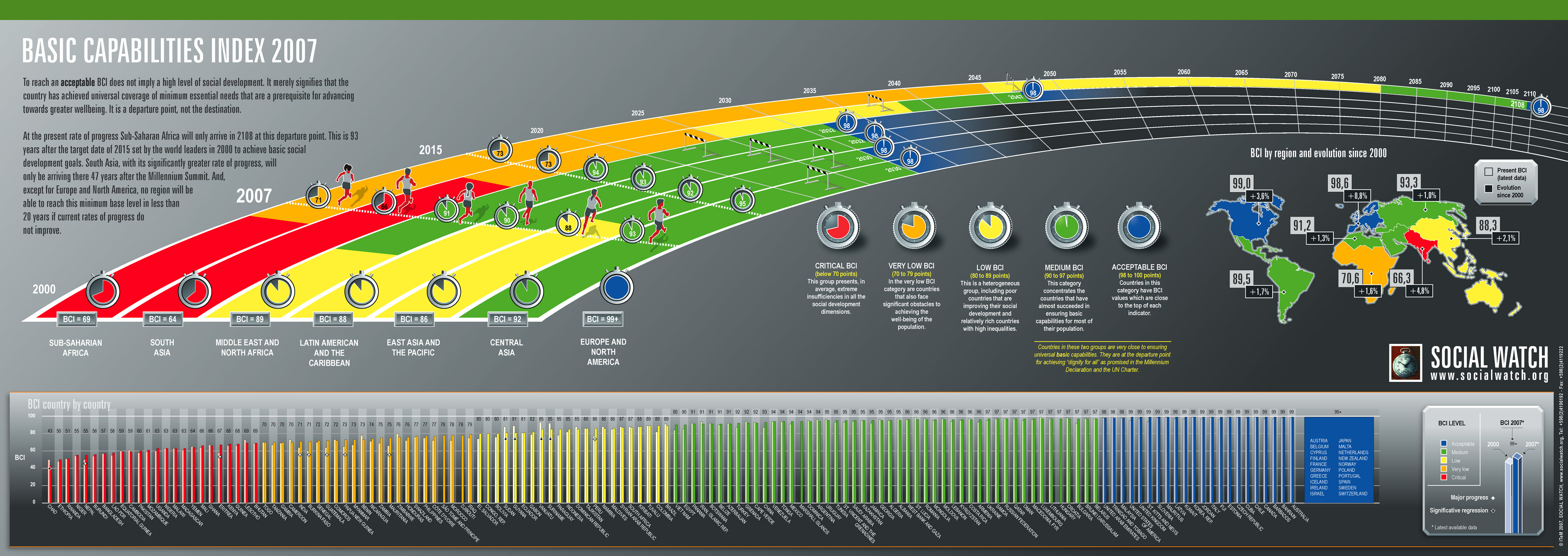July 7 (07/07/07) marks the middle date between the year 2000, when the leaders of the world committed themselves to achieve specific targets in the fight against poverty and the year 2015, which is when those Millennium Development Goals should be achieved. Yet, at the current slow rate of progress, in most countries the commitments will not be achieved. The Basic Capabilities Index (BCI), produced annually by Social Watch, compares and classifies countries according to their progress in social development. The BCI gets closer to 100% when countries ensure universal access to a minimum (or “basic”) set of social services (health, education, etc.). Achieving that level does not mean meeting all desirable social welfare objectives of any given society. It only signals a starting point towards them. The BCI numbers for 2007 reveal that half of the countries have a BCI reading of low or below and 24 countries are in a critical situation. If there is no substantial acceleration in the rate of progress by 2015 the average BCI value for countries in South Asia will not surpass critical, while Sub-Saharan Africa will have progressed only up to the very low level and all other regions except Europe and North America will still be far from “acceptable”. |