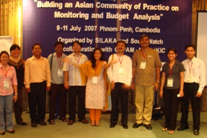 The workshop "Building an Asian community of practice on monitoring and budget analysis" was held in Phnom Penh, Cambodia, July 9 – 11 2007. The workshop was organized by SILAKA and Social Watch in collaboration with OXFAM- Novib/KIC, and brought together 23 participants from several countries in the region (Bangladesh, Cambodia, India, Indonesia, Mongolia, Nepal, Pakistan, Philippines, Thailand, Vietnam). The workshop "Building an Asian community of practice on monitoring and budget analysis" was held in Phnom Penh, Cambodia, July 9 – 11 2007. The workshop was organized by SILAKA and Social Watch in collaboration with OXFAM- Novib/KIC, and brought together 23 participants from several countries in the region (Bangladesh, Cambodia, India, Indonesia, Mongolia, Nepal, Pakistan, Philippines, Thailand, Vietnam). The workshop objectives were: To build capacities on budget monitoring, social indicators, rights-based approach, advocacy and networking. To strengthen participants’ skills to better understand and make use of monitoring and evaluation instruments. To create a space for the exchange of experiences and ideas on the topics of the workshop. And to promote joint work between the organizations and consolidate a sustainable network between Watchers and other CSOs or networks.