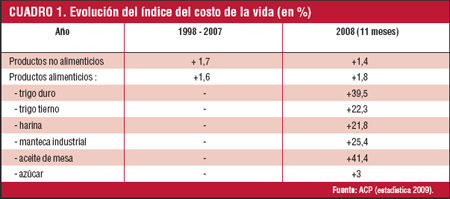 El tercer vector de debilitamiento de los estratos sociales vulnerables de la población es la inflación, cuya tasa ha aumentado severamente durante los dos últimos años, pasando de un nivel promedio inferior al 2% durante el período 1996-2007 al 3,9% en 2008. De todos modos, esta tasa oculta la amplitud del alza de los productos de primera necesidad durante los dos últimos años (ver cuadro). El impacto de estas alzas será más perjudicial para los estratos sociales desfavorecidos, entre quienes los productos alimenticios básicos (tales como, entre otros, cereales, azúcar y aceite de mesa) representan más del 50% del presupuesto familiar3.