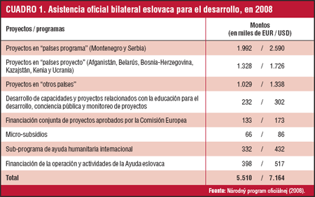 En el abril de 2008, se aprobó el Programa Nacional sobre Ayuda Oficial al Desarrollo en 2008. Los recursos financieros fueron destinados principalmente a Afganistán, Bielorrusia, Bosnia y Herzegovina, Montenegro, Kazajstán, Kenia, Serbia y Ucrania. Hubo también una suma global para varios otros países (Albania, Kirguistán, Macedonia, Mongolia, Mozambique, Sudán, Tayikistán y Uzbekistán). Sin embargo, aunque la AOD eslovaca en 2008 fuera más alta que en 2007, estaba todavía por debajo de los estándares de Unión Europea7.