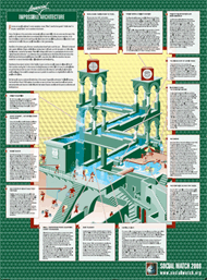 "The Earth is blue" said Yuri Gagarin in 1961 when he glimpsed the planet from the sky during the first manned space voyage. This social world map sizes countries according to their population and colours them according to their rank in the Basic Capabilities Index. Countries in blue provide their inhabitants with a minimum level of social services, while at the other extreme, countries in red face critical situations of deprivation. The colour scale of the circles shows degrees of progress towards gender equity. The governments of the world have agreed to achieve a set of basic standards known as the Millennium Development Goals by 2015. Once these goals are met, all countries should be coloured green or blue. Yet, at the present rates of progress 70 countries will miss the goals ten years from now and at least 25 will still be red. » |